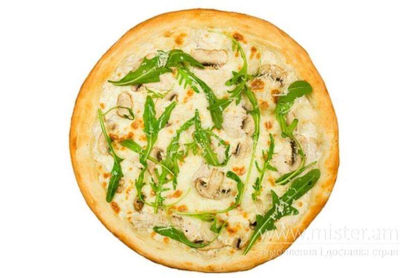 Тісто, білий соус, сир моцарела, гриби, куряче філе, пармезан, рукола.