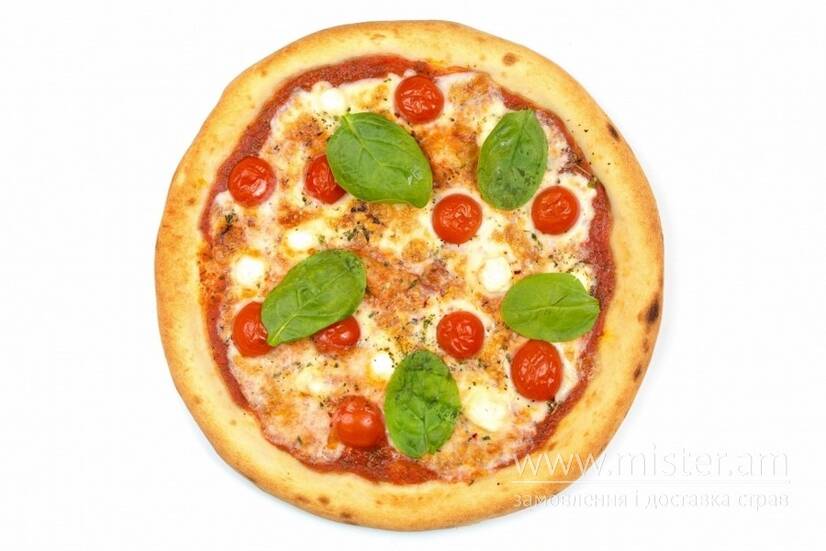 Тісто, червоний соус, сир моцарела, томати, вершковий крем-сир, шпинат, орегано.