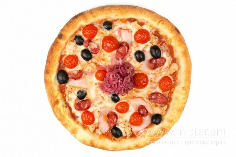 Тісто, червоний соус, сир моцарела, куряче філе, бекон, шинка, мисливські ковбаски, томати, маслини, цибуля маринована.