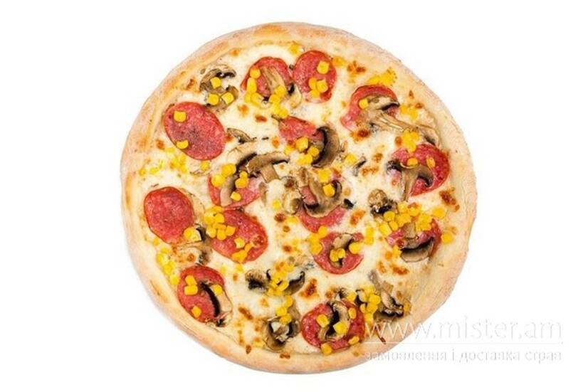 Тісто, соус білий, сир моцарела, гриби, салямі, кукурудза.
