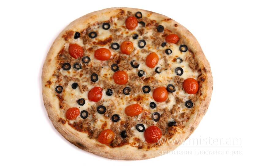 Тісто, червоний соус, сир моцарела, тунець у власному соку, томати, маслини.