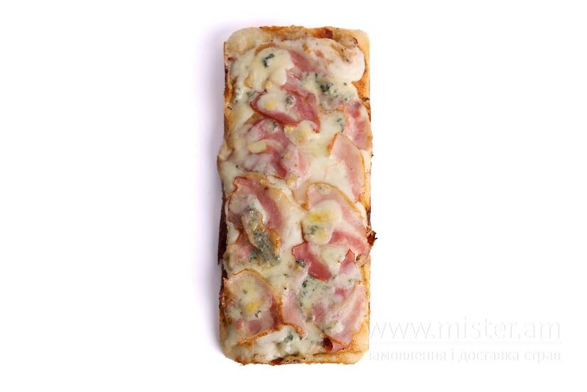 Тісто, червоний соус, сир моцарела, бекон, дор-блю.
