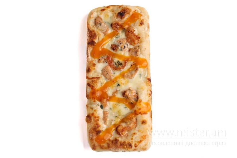 Тісто, білий соус, сир моцарела, тигрові креветки, куряче філе, дорблю, соус манго.