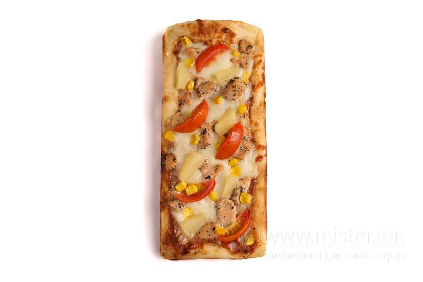 Тісто, червоний соус, сир моцарела, куряче філе, томати, ананас, кукурудза, сир пармезан.