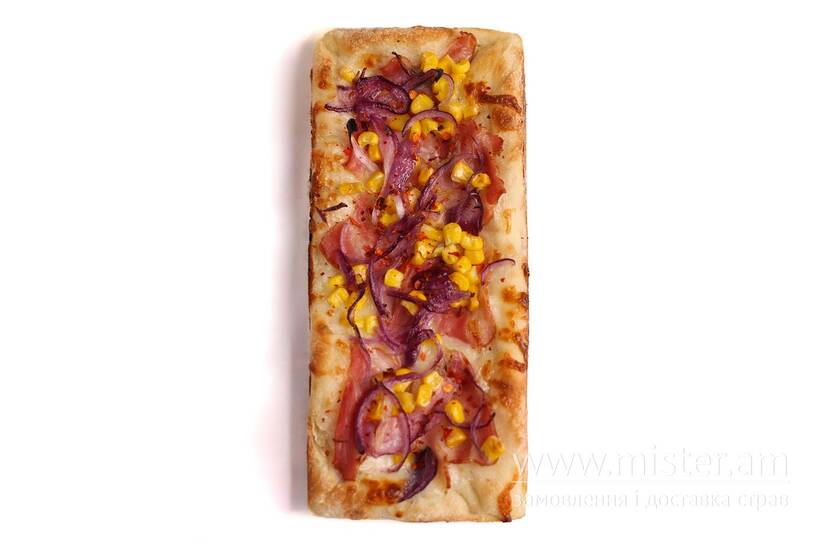 Тісто, білий соус, сир моцарела, бекон, кукурудза, цибуля маринована, перець гострий.