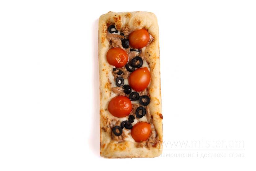 Тісто, червоний соус, сир моцарела, тунець у власному соку, томати, маслини.