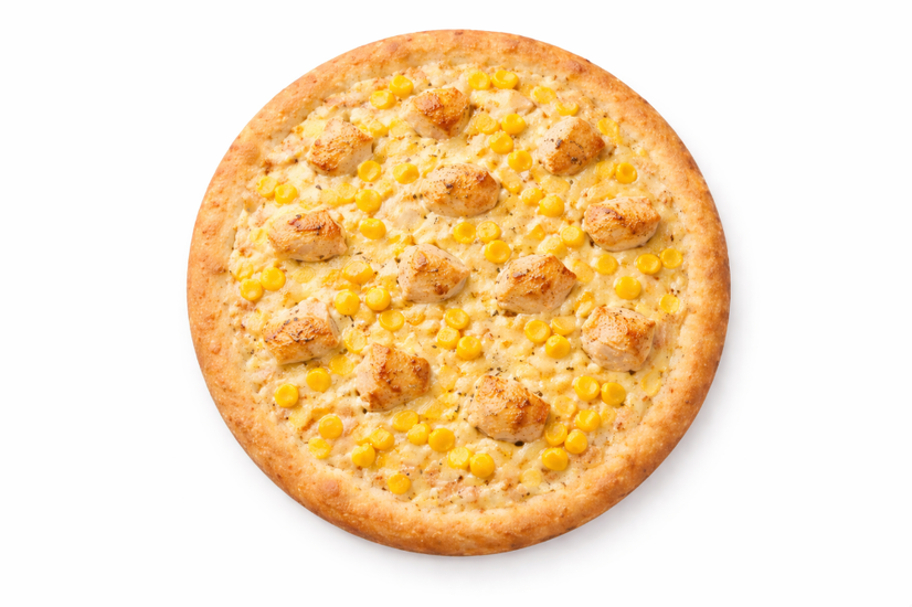 Тісто, білий соус, сир моцарела, чеддер, куряче філе, кукурудза.