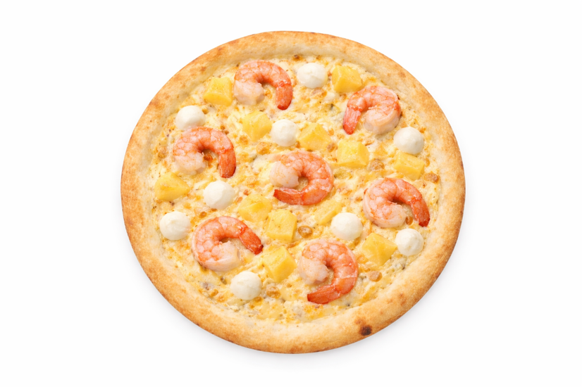 Тісто, білий соус, сир моцарела, чеддер, вершковий крем-сир, сир пармезан, креветки тигрові.