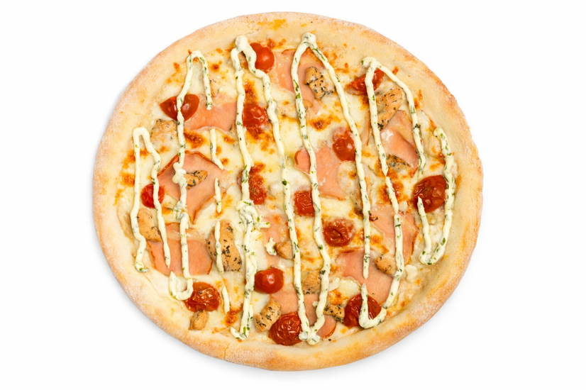 Тісто, білий соус, сир моцарела, куряче філе, шинка, томати, часниковий соус.