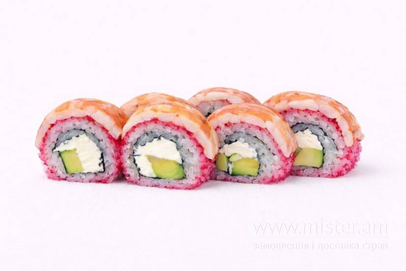 Суші-рис, норі, вершковий крем-сир, креветки тигрові, авокадо, рожева паніровка, соус манго.