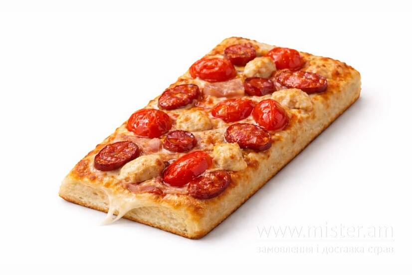 Тісто, червоний соус, сир моцарела, куряче філе, бекон, шинка, мисливські ковбаски, томати.