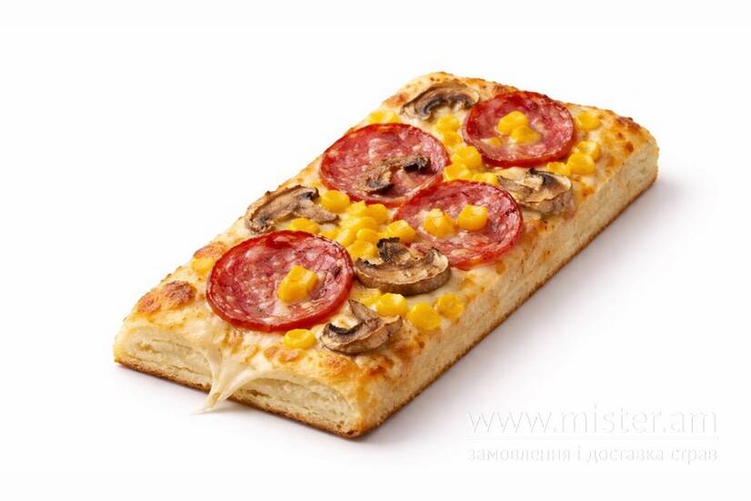 Тісто, соус білий, сир моцарела, гриби, салямі, кукурудза.