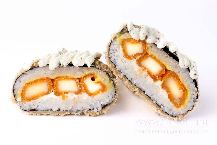 Суші-рис, норі, вершковий крем-сир, сир чеддер, сирні палички в паніровці, часниковий соус, темпура.