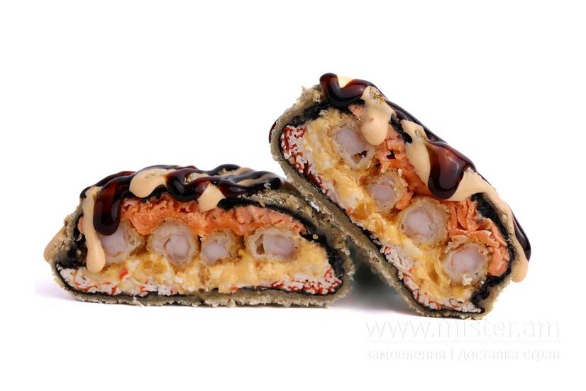 Норі, крабові палички, сирний соус, креветки в панко, лосось, соус спайс, соус унагі, темпура.
