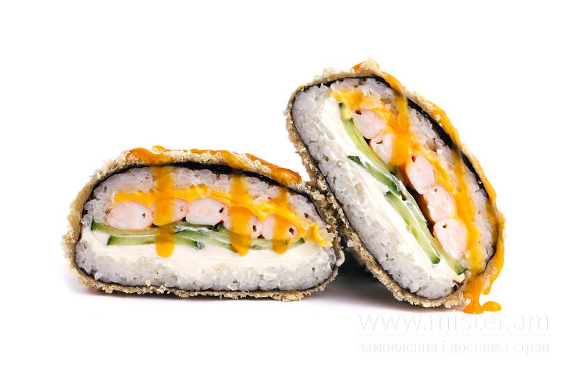 Суші-рис, норі, вершковий крем-сир, огірок, креветки, сир чеддер, соус манго, темпура.