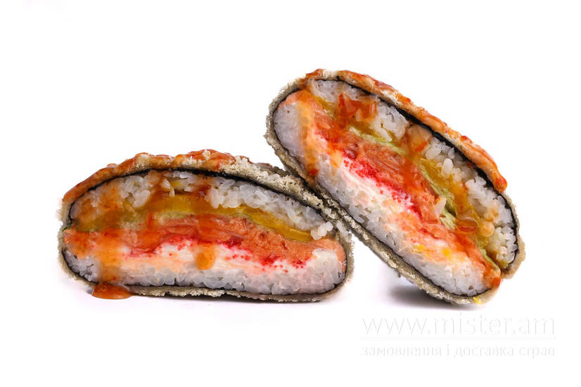 Суші-рис, норі, вершковий крем-сир, ікра тобіко, айсберг, манго, лосось, солодкий чилі, темпура.