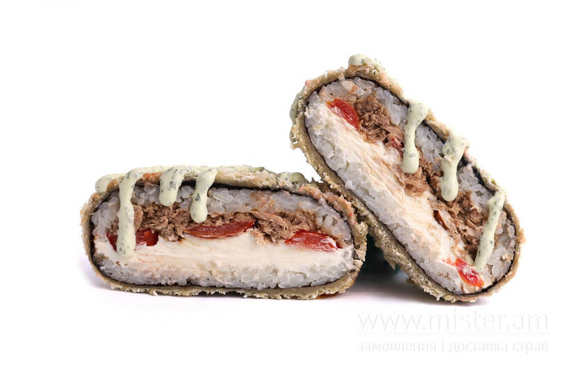 Суші-рис, норі, вершковий крем-сир, тунець у власному соку, томати, часниковий соус, цибуля фрі, темпура.