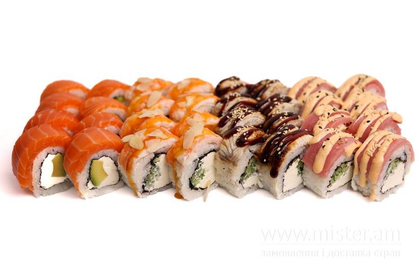 Філадельфія з лососем, Філадельфія з креветками, Філадельфія вугор, Філадельфія тунець.