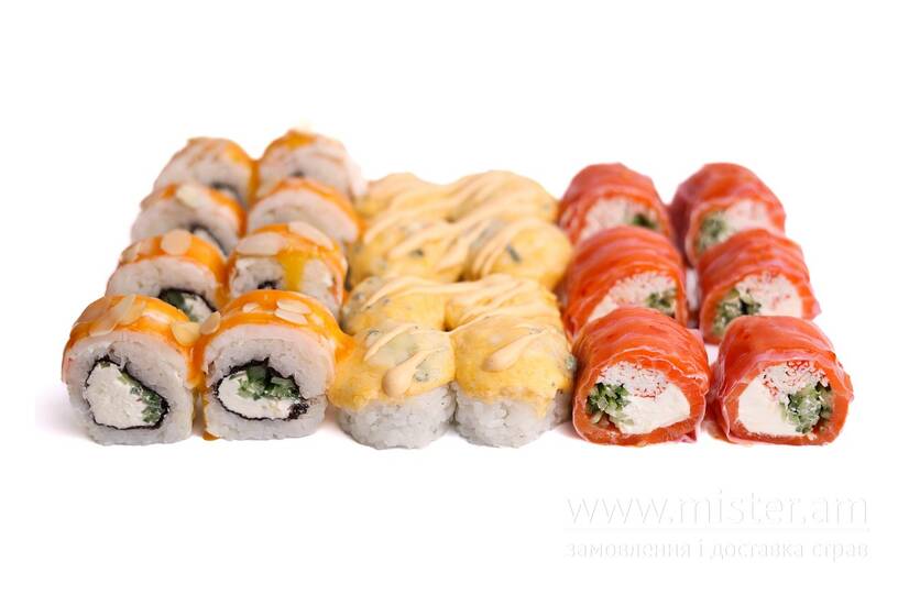 Філадельфія з креветками, запечений чіз, фірмовий ролз лососем (без рису).
