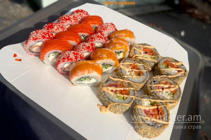 Філадельфія з лососем та креветками, Філадельфія в ікрі тобико, кунжуті з креветками в паніровці, Теплий рол з лососем.