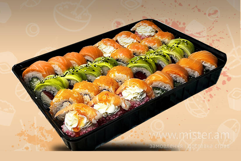 Філадельфія з лососем, Філадельфія з тунцем, Філадельфія тобіко, Віп р рол з креветками.