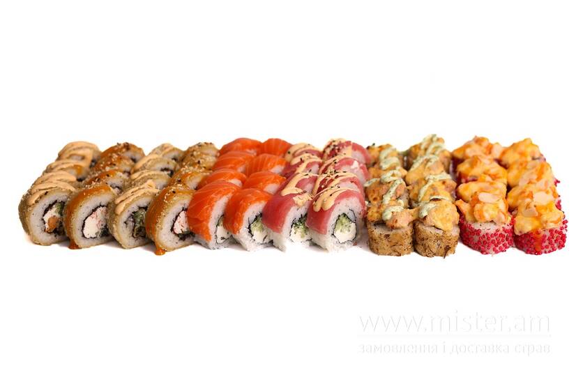 Філадельфія з лососем, Філадельфія з тунцем, запечений з креветками, запечений з тунцем, теплий з мідіями, теплий з крабом.