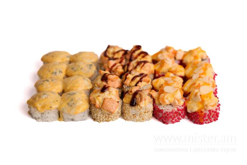 Запечений з лососем, запечений з креветками, запечений чіз.