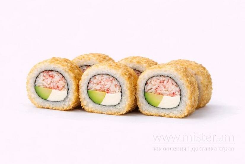 Суші-рис, норі, вершковий крем-сир, крабові палички, авокадо, темпура, соус спайс.