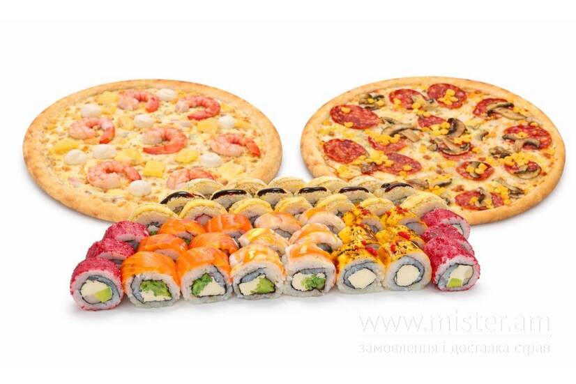 Філадельфія з лососем, Філадельфія з креветками , Філадельфія чіз, Філадельфія пінк з крабом, теплий рол з лососем, теплий рол з крабом, теплий рол з тунцем, піца Фірмова, піца куряча оптіма.