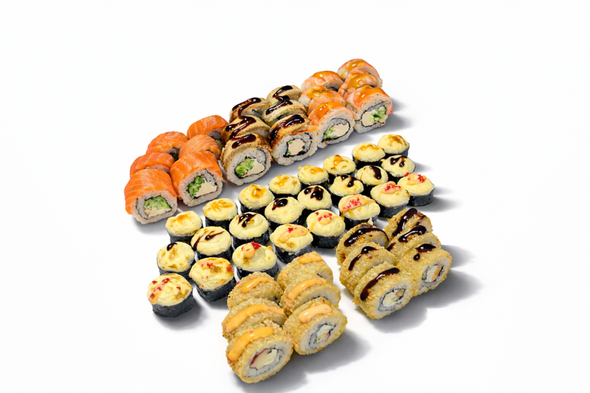 Запечений з лососем, запечений з креветками, запечений краб, теплий рол фрі з крабом, теплий рол фрі з мідіями, Філадельфія з лососем, Філадельфія тигрова, Філадельфія з вугрем.