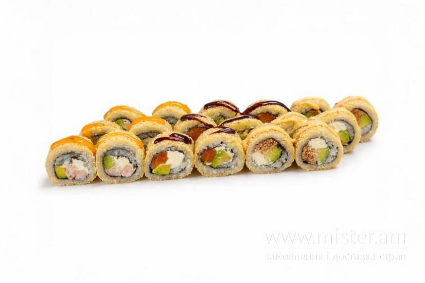 Теплий з лососем, теплий з тигровими креветками, теплий з тунцем.
