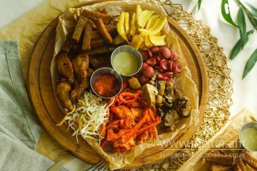 Вушка свинячі копчені, кільця кальмарів фрі, сир фрі, сухарі житні, картопля фрі, соус червоний та ніжний.