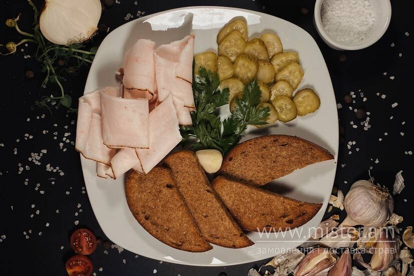 Грінки, сало, огірок солоний, кріп, петрушка, часник.
