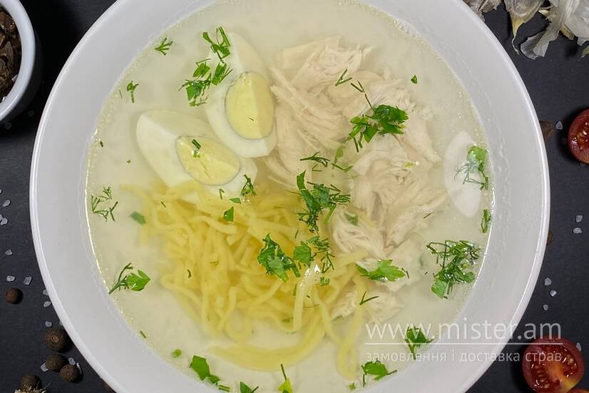 Куряче філе, курячий бульйон, локшина, яйце куряче, зелень.