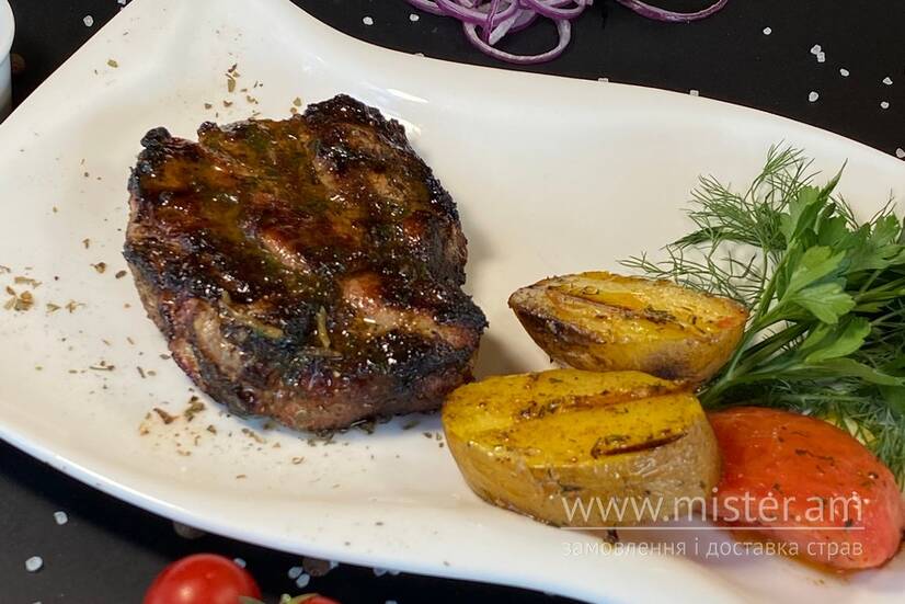 Свинина, картопля відварна, помідор, масло вершкове, часник.