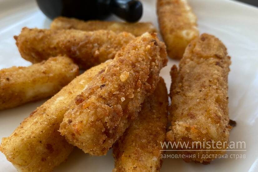 Сир моцарела, паніровка, соус аліолі: яйце, гірчиця, олія соняшникова, оцет яблучний, часник, кріп.