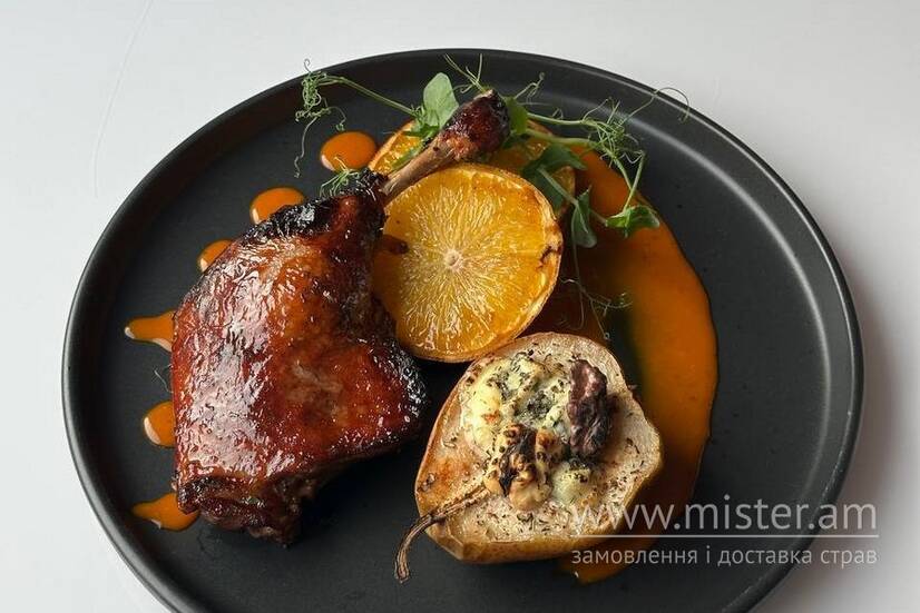 Качина ніжка, груша, сир з блакитною пліснявою, волоські горіхи, апельсин, соєвий соус, соус теріякі, мед, розмарин, мікрозелень, соус обліпиха-апельсин.