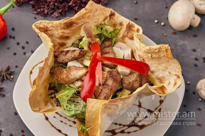 Яловичина, помідор, лист салату, гриби печериці свіжі, перець солодкий, сир фета,гірчична заправка, лаваш.
