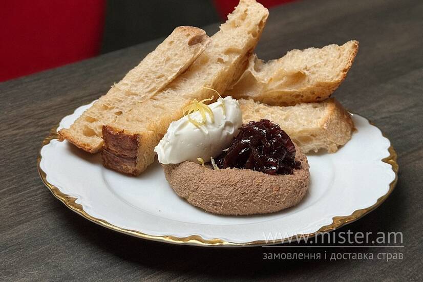 Ніжний паштет із курячої печінки з карамелізованою цибулею та крем-сиром із цитрусовою ноткою. Розмарин і лимонна цедра додають свіжості, а теплі тости — ідеальне доповнення до цієї класики.