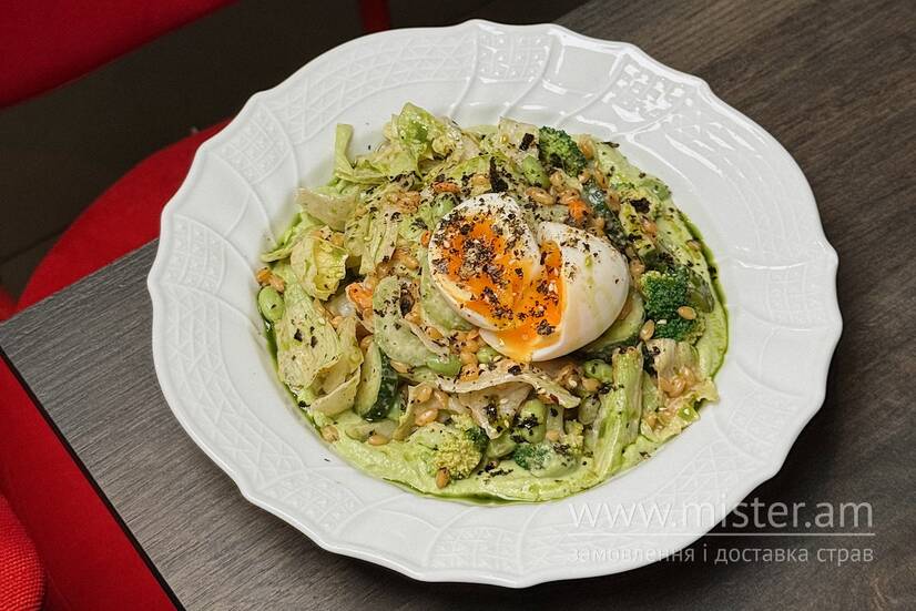 Яйце, мус з горошку, ромен, боби едамаме, огірок, цільнозернова пшениця, бланшировані броколі, селера, арахіс, олія зелена, фурікаке, мальдонська сіль, дрессінг кафір лайм.