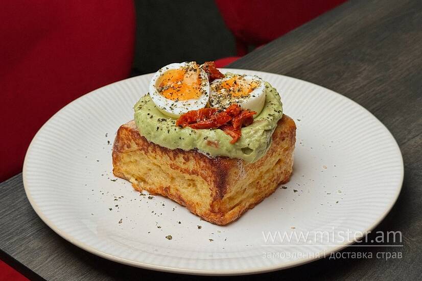 Авокадо тост у нашому баченні - мафін обсмажуємо з яйцем та молоком, додаємо гуакамоле, в`ялений томат, м`яке яйце та фурікаке.