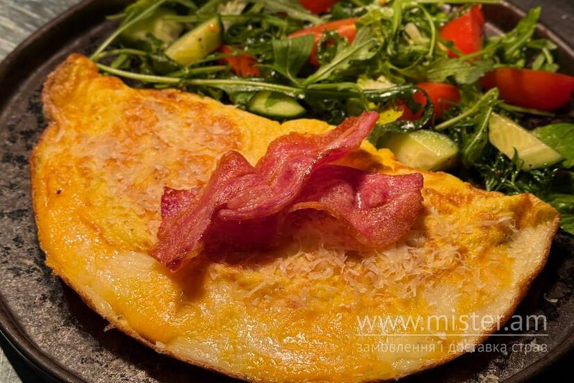 Омлет із трьох яєць на молоці з міксом сирів маасдам, моцарела, дор блю та чеддер, подаємо з обсмаженим беконом, пармезаном та салатом із ромену, рукколи, черрі й огірка із заправкою верде.