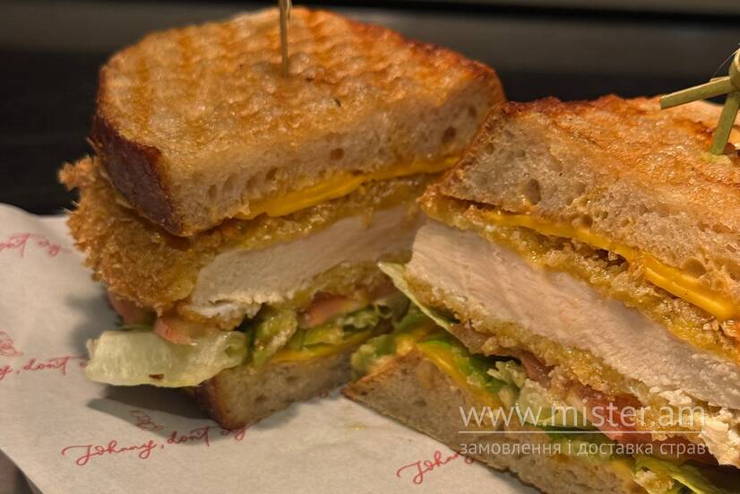 Мелт на тартіні з хрустким курячим філе в сухарях панко та сиром чеддер, подаємо з гуакамоле, яйцем, світлою місо-пастою, острівним соусом, томатом та салатом ромен.