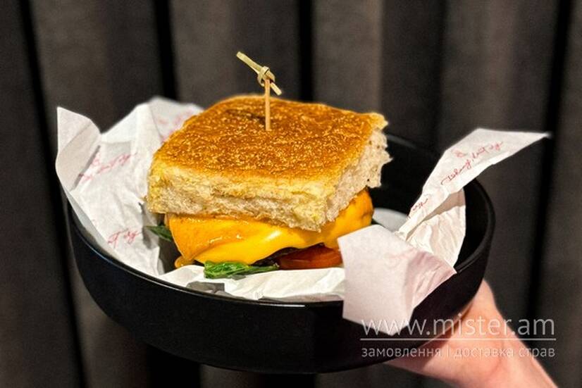 Яловича котлета в цільнозерновому мафіні зі спельти, доповнена сирами моцарелою, чедером, масдамом, рокфору, а також роменом, солоним огіркою та соусом крем-чіз. Радимо додати батат в категорії "доповнення".