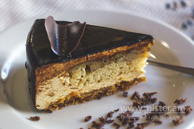 Багатошаровий банановий торт. Банани фламбе, банановий бісквіт, мигдальний штройзель і солона карамель оповиті в карамельний мус. Покритий шоколадною глазур`ю. Торт розрізаний на вісім порцій. Вкажіть в коментарі і ми залишимо його цілим. Так само доступний порційно.
