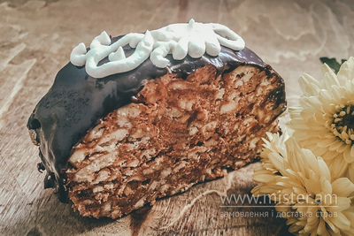 Спеціально випечена крихта, масляний крем з вареного згущеного молока, шоколадний декор.