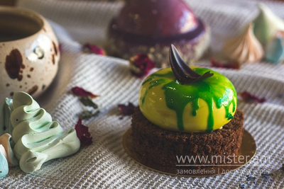 Мусове тістечко на подушці шоколадного шифонового бісквіта. Мус на основі білого шоколаду з лимонно-лаймовим "серцем" всередині.