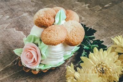 Пісочна корзинка змащена шоколадом, шматочки чорносливу і натуральні збиті вершки.