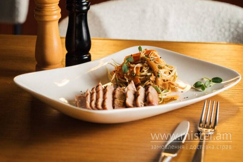 Морква, капуста, мариновані гриби, гірчиця, соус унагі.