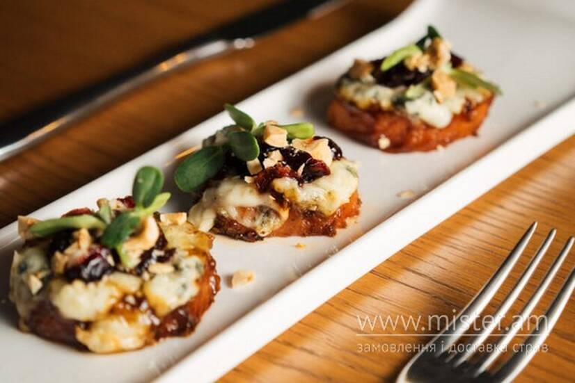 Кремінь Запечений батат з блакитним сиром, журавлиною та горіхами з кисло-солодким соусом